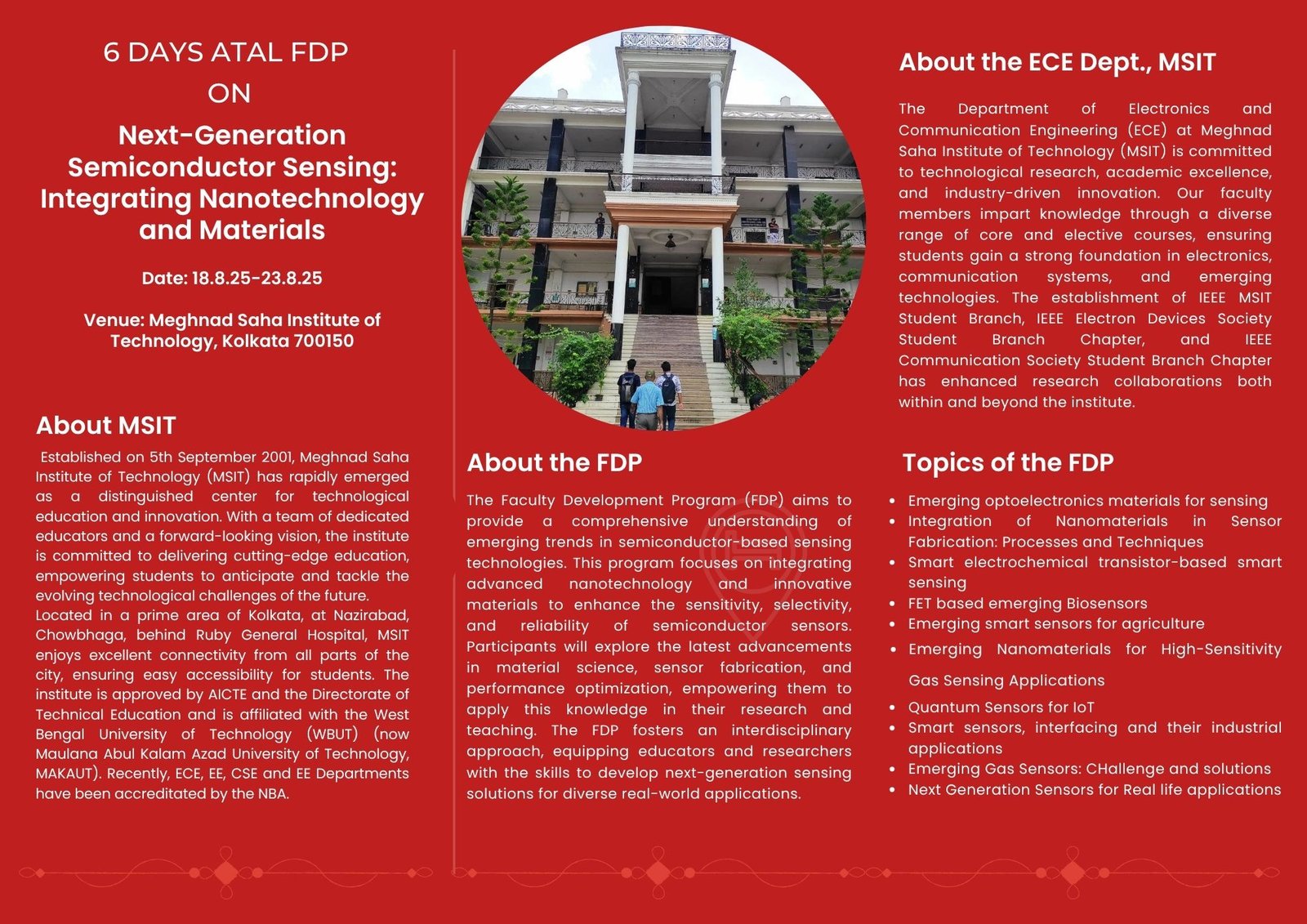 This FDP aims to provide in-depth knowledge and hands-on insights into recent advancements in semiconductor sensor technologies and the integration of nanomaterials. Sessions will be conducted by renowned academicians, researchers, and industry experts.